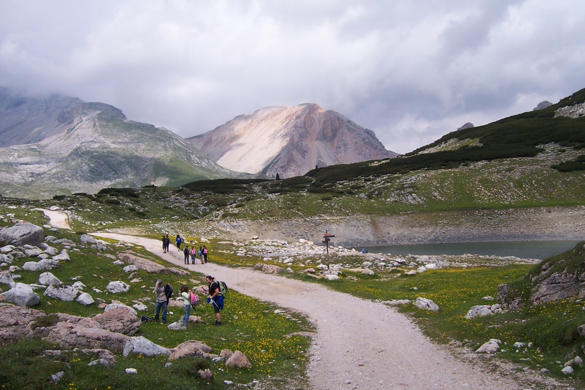 Z Obertilliachu se odbočka vlevo nedá minout, neboť hledaná cesta je ze silnice vidět do dáli a je to v podstatě jediná cesta, která tudy vede. Bohužel silnička vede nejprve dolů z kopce a člověk tak během pár desítek vteřin ztratí asi padesát těžce nastoupaných výškových metrů. V těchto místech je nádherně upravené dětské hřiště s různými atrakcemi, a protože zde nikdo nebyl, sami jsme si s radostí některé z nich vyzkoušeli. Dál už končí asfalt a vede jen šotolinová cesta. Nejprve je stoupání mírné a cesta velmi kvalitní, po několika kilometrech se oboje zhorší. Zpočátku se jede lesem, později stromů ubývá a začínají ty „pravé“ Dolomity. Ve výšce 1700 m n.m. jsme narazili na nádherné horské jezero, které není kupodivu vyznačeno ani na nejpodrobnější mapě, kterou jsme s sebou měli. Panorama je zde kouzelné – blankytně modré jezero a na pozadí strmé štíty hor. Kdyby tuto scenérii chtěl malíř realisticky zachytit na plátno, mnoha lidem by to připadalo tak neskutečné, že by to považovali za kýč. Zcela uchváceni jsme zůstali hledět a jako malé děti jsme pobíhali kolem a fotografovali okolní krajinu. Už tady jsme si říkali, že jen pro tento zážitek se naše cesta vyplatila. To jsme ještě netušili, že podobné pocity jsme v následujících třech dnech prožijeme ještě mnohokrát!