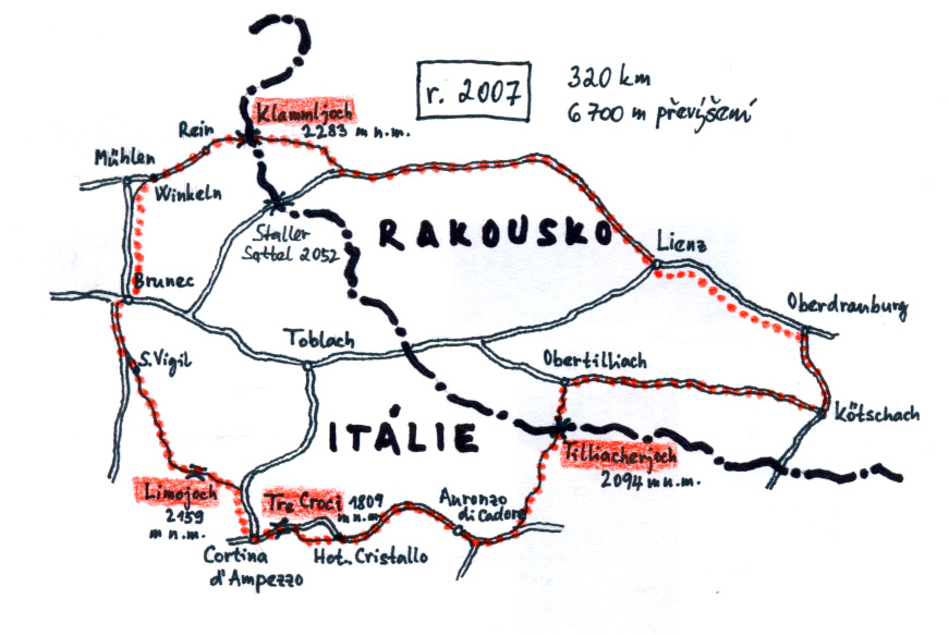 Stejně jako každý rok, i letos koncem června (2007), jsem se svým kamarádem Liborem a jeho synem vyrazil na pomezí rakousko-italských hranic s cílem vyjet si několik vysokohorských průsmyků. Zatímco předchozí roky jsme jezdili výhradně silniční, tedy asfaltové průsmyky, letos jsme naznali, že by to byla už nuda a moc „snadné“ (navíc mezi auty a motorkami to není dvakrát příjemné) a rozhodli se tak pro zdolání průsmyků těmi cestami, kam mají motorová vozidla vjezd zakázán. To vše i přesto, že jezdíme výhradně „natěžko“, tj. s koly ověšenými brašnami.