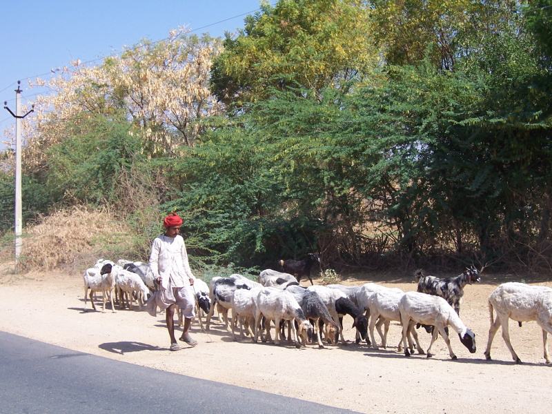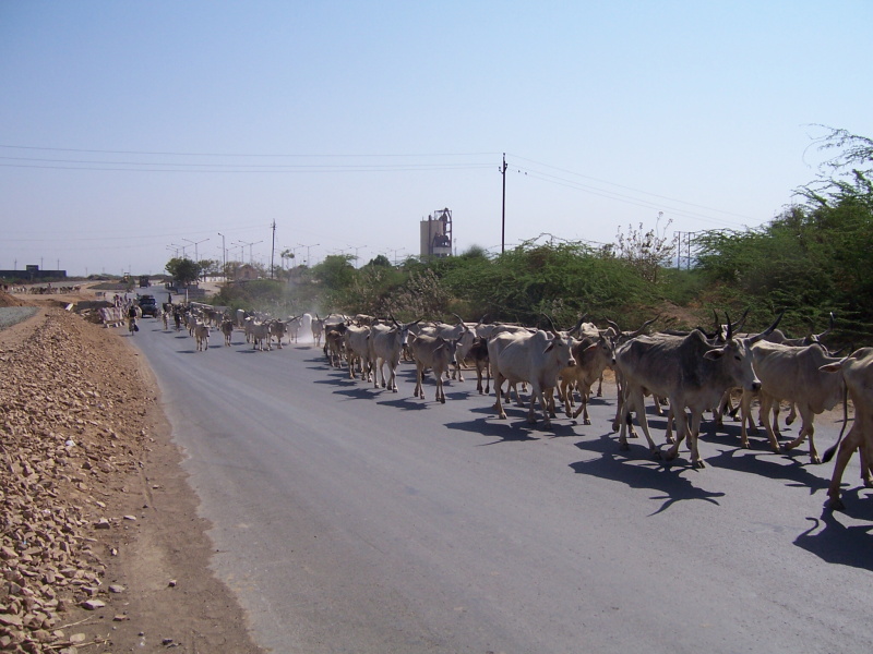 Silnice byla prvních pár desítek kilometrů ve výstavbě, tzn. že se zde stavěla čtyřproudá silnice, stejná, jako vedla z Ahmedabadu. Většinu cesty byl ale jeden pěkný asfaltový dvojpruh, takže se dalo jet docela svižně, i když byly sem tam krátké, velmi špatné úseky. Podle počtu stavební techniky, dělníků a jejich úsilí soudím, že se tato silnice zřejmě staví dodnes. Krajina byla rovinatá a hodně vyprahlá, kromě silnice byl všude jen prach, písek a řídký suchý porost. Stromů a tedy jejich stínů bylo jako šafránu, aut proti včerejšku výrazně ubylo.