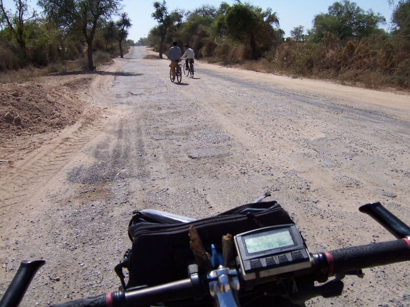 Ranních 20 °C mi připadalo jako úplná „kosa“. Normálně jsem se chvíli třepal, než jsem se šlapáním trochu rozehřál. Odbočku, kterou jsem měl sjet z hlavní, jsem našel snadno, protože jsem tudy jel opačným směrem již včera a zrovna zde jsem potkal nějaké vesničany na velbloudech. Ptal jsem se jich, jestli je to správná odbočka na vesnici Mandar. Anglicky neuměli, ale slovu Mandar rozuměli dobře a tak horlivě kývali. Sice mě pak napadlo, že si třeba mysleli, že se můžu ptát na to, „jestli znají Mandar“ nebo „jestli pochazejí z Mandaru“ apod., takže teoreticky by mi asi odkývali vše, co se Mandaru týká. Nicméně jsem to nyní riskl a dobře jsem udělal. Směr se ukázal být správným.