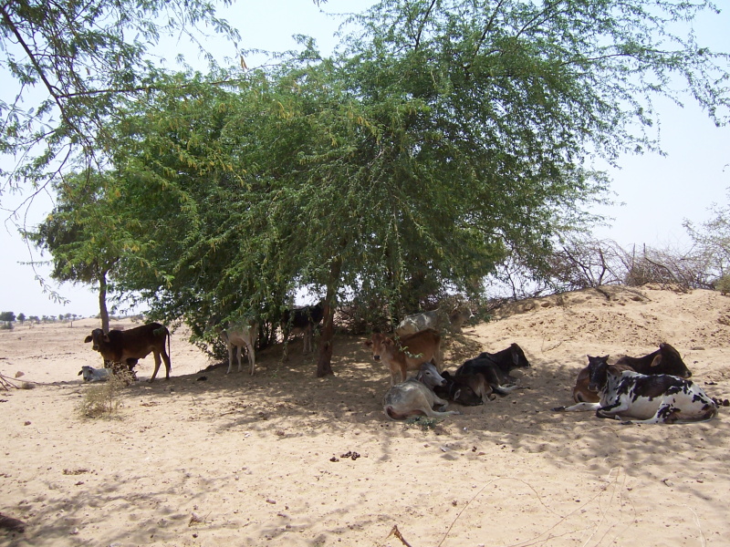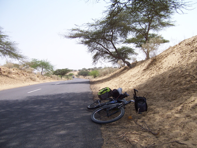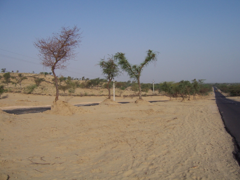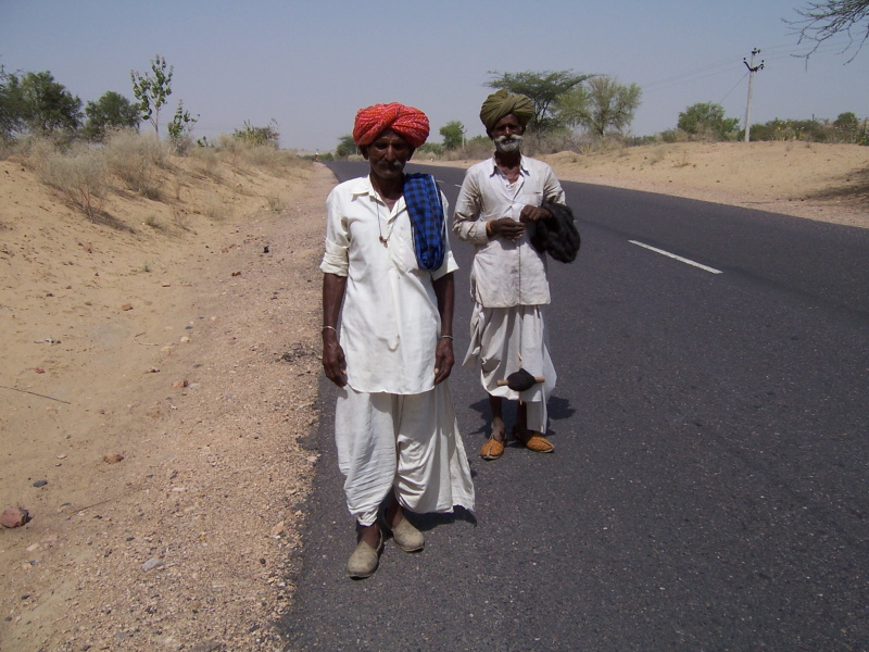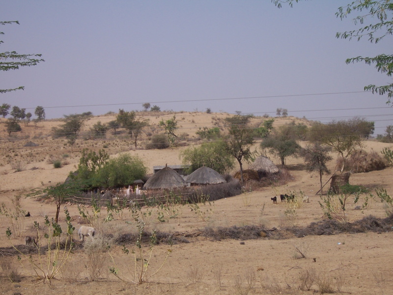 Podle mapy jsem se měl dnes konečně dostat na Radžastánskou poušť. Docela jsem se na ni těšil, neboť na podobných místech si člověk ověří a částečně i upevní nejen svoji fyzickou, ale hlavně psychickou odolnost. Představoval jsem si ji podobně jako Saharu, ve skutečnosti tu byl stále široko daleko nějaký porost. Sice nízký a suchý, ale byl, dokonce i sem tam nízké stromy. Pískových jazyků oproti předchozím dnům sice přibylo, ale pořád to nesplňovalo moji představu pravé pouště, přestože jsem minul několik maličkých vesniček s kruhovými domky a slaměnými střechami, které bych řadil spíše do Afriky než do Indie. Výrazně také přibylo velbloudů.