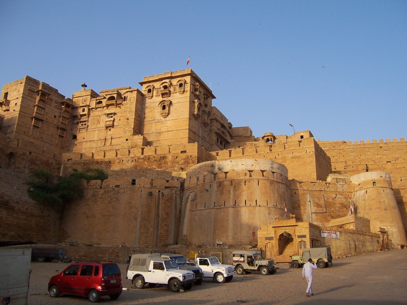 Pouštní město Jaisalmer jsem znal již z fotek – nad „obyčejným“ městem se tyčí na kopci obrovská pevnost, která byla teď večer (19.15 hod.) nádherně osvícená. Je to jako jeden z dalších z divů světa – po nekonečné poušti se náhle před cestovatelem zjeví vysoký kopec a na něm je vystavěno něco naprosto velkolepého. To se ani nedá slovy pořádně popsat, to se musí vidět na vlastní oči. Pevnost je plně obydlená a je to tedy „město ve městě“.