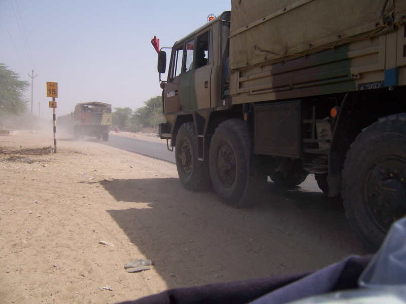 Když jsem vyjel za město, pouštní charakter se oproti včerejšku trochu změnil. Ubyla vegetace a přibylo kamení. Vesničky v poušti již neměly kruhový charakter jako včera, ale domy byly obdélníkové, i když stále se slaměnou střechou. Naštěstí byly natolik vzdáleny od silnice, že mě pokřikující omladina neměla šanci dohonit. Silnice byla přímá a po totální rovině, navíc při teplotách kolem 50 °C a bez jediného náznaku vánku. Čekalo mě však jen 110 km, takže teoreticky to měla být „pohodička“, prakticky jsem zažil opět další jízdu „na morálku“. Ne však kvůli krajině nebo počasí, ale proto, že se dnes indická armáda rozhodla provádět manévry a tudíž mě, po jinak prázdné silnici, míjela v obou směrech jedna těžká vojenská kolona za druhou. Pakistánské hranice jsou odtud jen pár desítek kilometrů a vojenské napětí mezi oběma státy je zde pořád cítit. Indická armáda zde dokonce provedla v roce 1998 pět nukleárních „zkušebních“ výbuchů. Zuřil jsem, ale nedalo se už nic jiného dělat, než dojet ve zvířeném prachu až do cílového Pokaranu.
