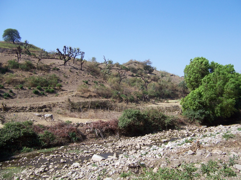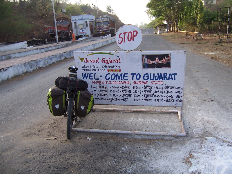 I když úzká, přesto velmi kvalitní silnice bez jakéhokoliv provozu, začala stoupat hned po vyjetí z Abu Road. Vlnila se mezi ostrými kopci, řídce porostlými stromy a dokonce jsem zahlédl v korytě řeky malý potůček. Všude jinde byla většina řek v tuto roční dobu vyschlých. Moc se mi tady líbilo a blahořečil jsem si, že jsem se dal s chlapíkem do řeči. Ani ne po hodince jízdy jsem překročil hranice mezi Radžastanem a Gujaratem. Sice zde byla jakási závora a pár vojáků, ale nikoho nenapadlo mě zastavovat.