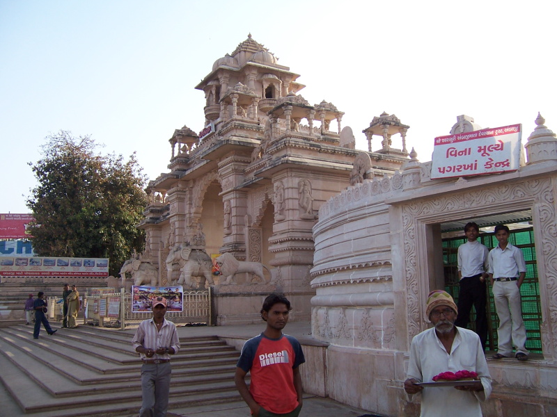 Přestože je Ambaji na mapě vyznačeno téměř jako vesnice, ve skutečnosti to je dost veliké a indickými turisty hojně navštěvované město. Na hlavní třídě mu vévodí obrovský bílý chrám, který se mi však nechtělo navštívit. Ne že bych spěchal, ale měl jsem pocit, že uvnitř podobných chrámů jsem byl už nesčetněkrát, takže jsem jen zastavil, povykládal s mladíky, kteří prodávali před chrámem turistické artikly a po pár minutách jel dál. Možná se mně také nechtělo handrkovat s místními, kde mohu zanechat opřené kolo a určitě jsem byl líný zouvat si boty. Překvapilo mě však, kolik hotelů a gesthausů bylo jen na této hlavní ulici.
